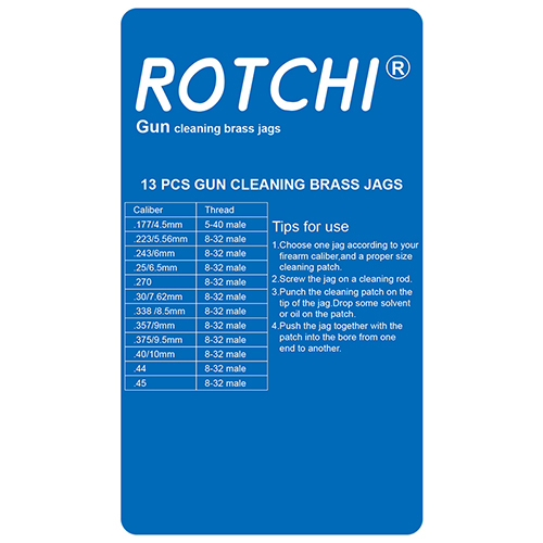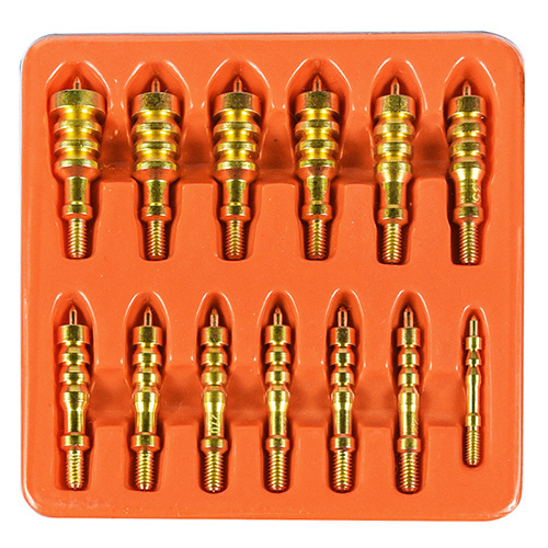 13-पीसी पैक बंदूक सफाई पीतल के जग सेट, ब्लिस्टर कार्ड पैकेज, आकार: .177, .22, 6 मिमी, .25, .27, .30, .338, .35, .357, .40, .44, .45, .50कैलोरी।