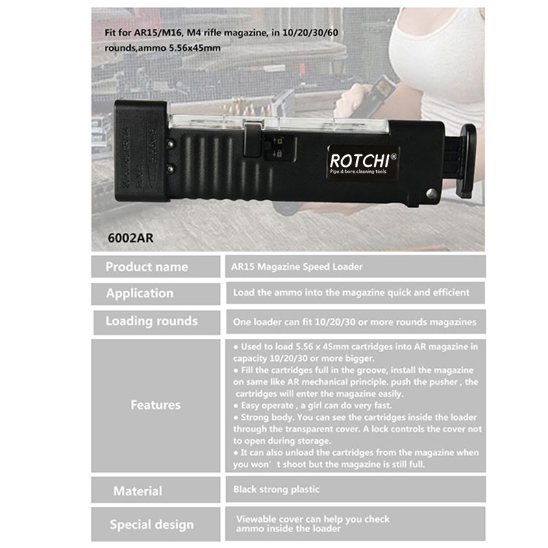 5.56x45 मिमी कारतूस के लिए गन मैगज़ीन स्पीड लोडर प्रबलित प्लास्टिक बॉडी से बना है, जिसका व्यापक रूप से एआर मैगज़ीन क्षमता 10-30 में कारतूस लोड करने के लिए उपयोग किया जाता है।