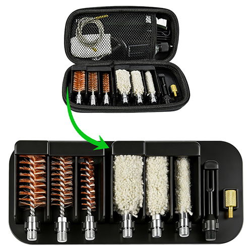 शॉटगन सफाई किट में 3 आकार (12/16जी, 20जी, 410) शामिल हैं। पीतल के ब्रश और सूती मोप्स, 4 छड़ें 1 कैल्ब। विकल्पों के लिए रेत और काला रंग।